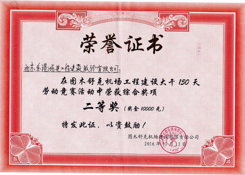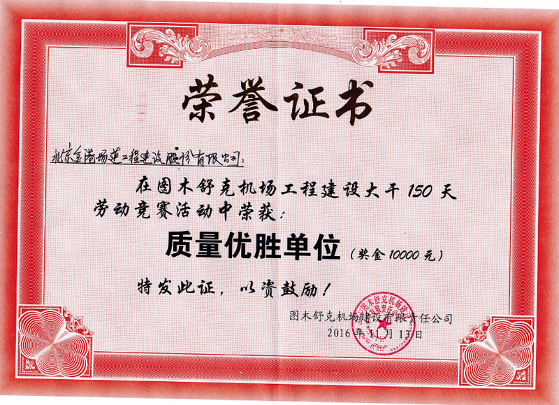 2016年11月13日,圖木舒克機(jī)場(chǎng)指揮部隆重召開“大干150天”勞動(dòng)競(jìng)賽總結(jié)表彰大會(huì),北京金港場(chǎng)道工程建設(shè)股份有限公司在此次競(jìng)賽中榮獲綜合獎(jiǎng)項(xiàng)二等獎(jiǎng)以及質(zhì)量?jī)?yōu)勝單位榮譽(yù)稱號(hào),并榮獲獎(jiǎng)金20000元。同時(shí)我項(xiàng)目部張力強(qiáng)和趙志軍同志被評(píng)為2016年度先進(jìn)個(gè)人。