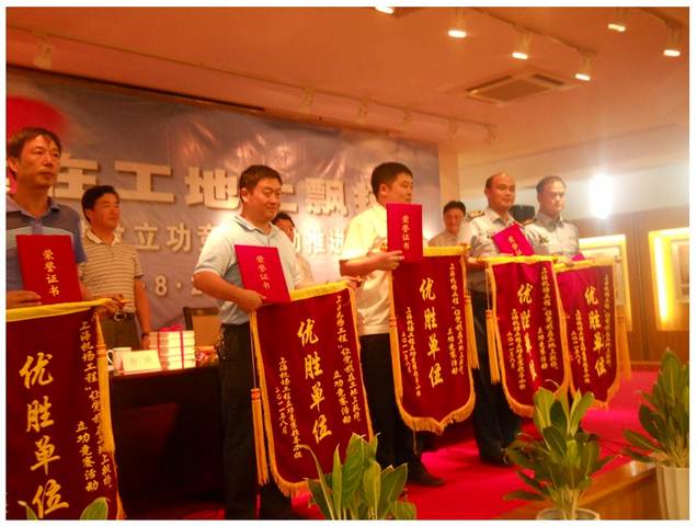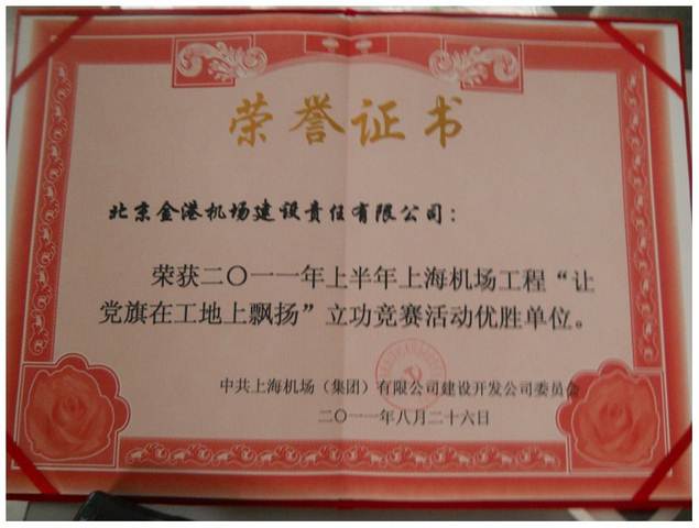 我公司是5家優(yōu)勝單位之一,建設(shè)開發(fā)公司黨委專門發(fā)文(滬機(jī)建委[2011]40號(hào))通報(bào)表彰,授予公司“2011年度上海機(jī)場(chǎng)工程‘讓黨旗在工地上飄揚(yáng)’上半年立功競(jìng)賽活動(dòng)優(yōu)勝單位”,頒發(fā)錦旗和榮譽(yù)證書。