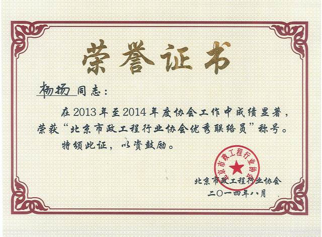 為感謝廣大聯(lián)絡(luò)員在協(xié)會(huì)工作中所發(fā)揮的作用,鼓勵(lì)先進(jìn),樹立典型,進(jìn)一步推動(dòng)協(xié)會(huì)工作開展,根據(jù)優(yōu)秀聯(lián)絡(luò)員評(píng)選條件,經(jīng)廣泛征求意見,會(huì)議決定向60位同志授予2014年度北京市政工程行業(yè)協(xié)會(huì)優(yōu)秀聯(lián)絡(luò)員,場(chǎng)道股份公司楊揚(yáng)榮獲該稱號(hào)。在對(duì)接北京市政工程行業(yè)協(xié)會(huì)開展創(chuàng)獎(jiǎng)評(píng)優(yōu)工作上,我公司聯(lián)絡(luò)員的積極主動(dòng)姿態(tài)得到了協(xié)會(huì)領(lǐng)導(dǎo)的充分肯定和鼓勵(lì)。會(huì)上,協(xié)會(huì)領(lǐng)導(dǎo)號(hào)召各會(huì)員單位聯(lián)絡(luò)員以優(yōu)秀聯(lián)絡(luò)員為榜樣,認(rèn)真履行聯(lián)絡(luò)員紐帶職責(zé),為企業(yè)和行業(yè)共榮添磚加瓦。(特約通訊員 曾德德供稿)