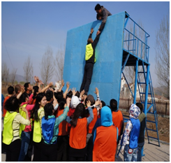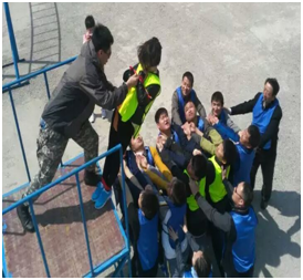 當(dāng)只剩下最后兩個(gè)人的時(shí)候,項(xiàng)目的難度再一次加大,一個(gè)人用雙手雙肩支撐最后一個(gè)人,使其能夠和墻體頂部的人匯合,而最后一個(gè)人則是要靠攀爬的方式攀附到倒數(shù)第二個(gè)人的身上,最后一刻,大家的心都懸起來了,撕裂的聲音一遍遍的傳來,“小心”“加油”“小心”“成功啦”“成功啦”