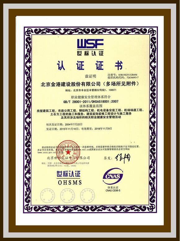 2015年11月11日,我公司順利通過北京世標認證中心的貫標復審,取得新的世標認證證書。此次審核涉及的北京金港建設股份有限公司、北京金港場道工程建設股份有限公司、北京金港文景裝飾有限責任公司,均順利取證。北京世標認證中心有限公司總經(jīng)理李永波為我公司頒發(fā)了新證。