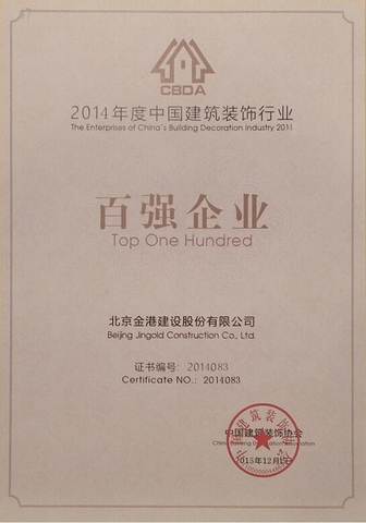 近日,從中國(guó)建筑裝飾協(xié)會(huì)傳來(lái)喜訊,我公司在中國(guó)建筑裝飾行業(yè)百?gòu)?qiáng)企業(yè)評(píng)選活動(dòng)中榮獲“2014年度中國(guó)建筑裝飾行業(yè)百?gòu)?qiáng)企業(yè)”榮譽(yù)稱號(hào)。