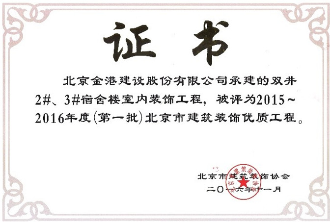 2016年12月28日,北京市建筑裝飾協(xié)會(huì)六屆三次理事會(huì)暨市優(yōu)項(xiàng)目頒獎(jiǎng)大會(huì)隆重舉行,我公司董事長(zhǎng)譚子恒及副總經(jīng)理閆麗英應(yīng)邀參會(huì),大會(huì)對(duì)2015—2016年度北京市建筑裝飾優(yōu)質(zhì)工程進(jìn)行了表彰,公司承建的華晨寶馬汽車有限公司發(fā)動(dòng)機(jī)廠綜合樓室內(nèi)裝飾工程,雙井1#宿舍樓室內(nèi)裝飾工程,雙井2#、3#宿舍樓室內(nèi)裝飾工程以卓越的設(shè)計(jì)和精良的施工質(zhì)量榮獲2015—2016年度北京市建筑裝飾優(yōu)質(zhì)工程。