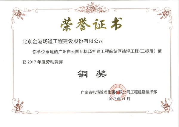 場(chǎng)道股份公司廣州白云機(jī)場(chǎng)項(xiàng)目部喜獲廣州白云國(guó)際機(jī)場(chǎng)擴(kuò)建工程勞動(dòng)競(jìng)賽銅獎(jiǎng)