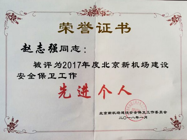 2018年1月23日,北京新機(jī)場(chǎng)建設(shè)指揮部聯(lián)合安全保衛(wèi)部于指揮部工人禮堂組織召開了“2017年北京新機(jī)場(chǎng)安全保衛(wèi)工作交流會(huì)暨優(yōu)秀項(xiàng)目部表彰會(huì)”。我單位北京新機(jī)場(chǎng)項(xiàng)目部作為安全保衛(wèi)工作優(yōu)秀單位應(yīng)邀參加了此次盛會(huì)并作了精彩匯報(bào),得到了與會(huì)專家和領(lǐng)導(dǎo)的肯定,被授予“北京新機(jī)場(chǎng)優(yōu)秀項(xiàng)目部”榮譽(yù)稱號(hào),項(xiàng)目部技術(shù)負(fù)責(zé)人趙志強(qiáng)同志同時(shí)榮獲優(yōu)秀個(gè)人獎(jiǎng)。