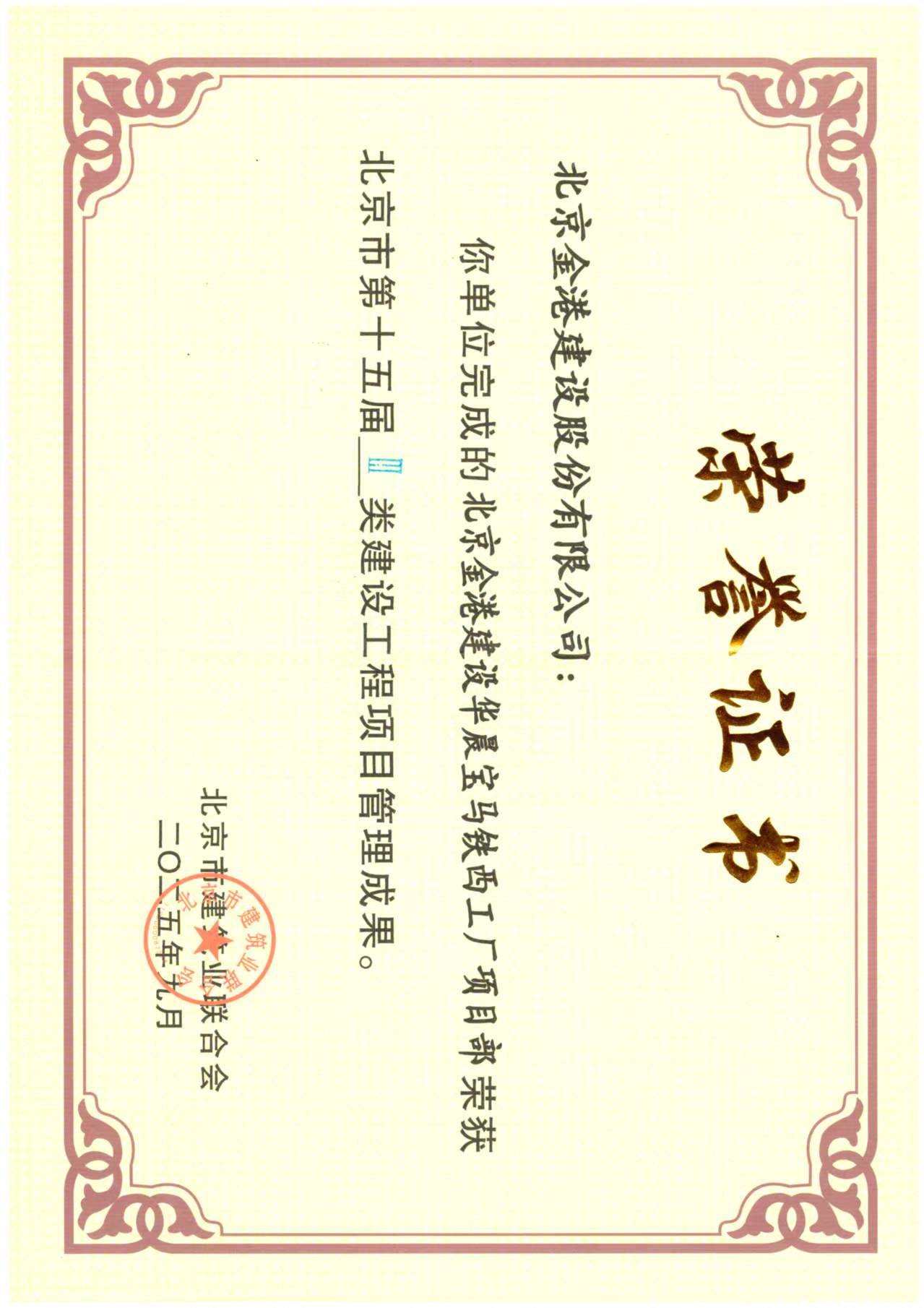 經(jīng)大會(huì)評(píng)審,我公司沈陽(yáng)華晨寶馬項(xiàng)目所分享的管理成果,榮獲了“北京市建設(shè)工程管理III類(lèi)成果獎(jiǎng)”。這一榮譽(yù)是對(duì)我公司在工程項(xiàng)目管理,特別是在技術(shù)創(chuàng)新與應(yīng)用方面所做努力和取得成績(jī)的充分肯定。